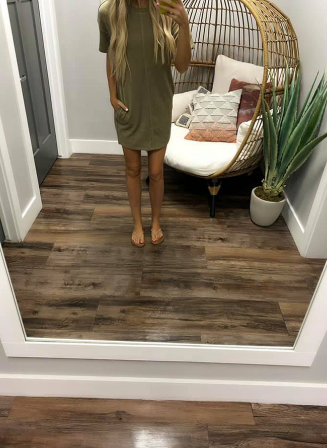 OLIVE RIBBED POCKET KNEE LEGNTH DRESS