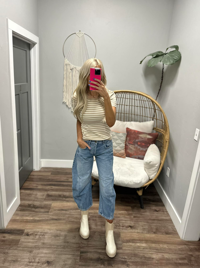 TAWNY KHAKI SHORT SLEEVE STRIPE SWEATER TOP